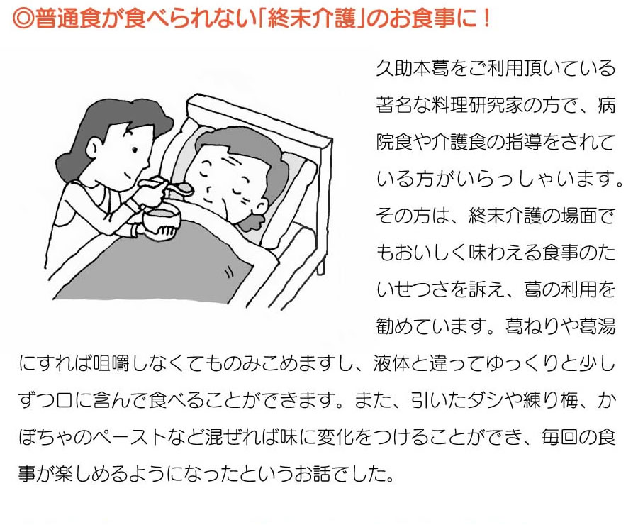 「風邪をひいたら葛湯をつくって飲むと良い」という話は、昔から知られてきた民間療法の一つです。本葛を製造している当店では,お腹をこわしたときも必ず葛湯をのんでいました。もちろん葛は食品ですが、健康づくりに役立つ利用の仕方がたくさんあります。実際に久助本葛を利用されている方のお話と、その場面をいくつかをご紹介しましょう。