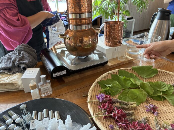 先日秋月で行われた蒸留は透明な器具でしたが、こちらは銅の蒸留器のようです。小瓶にポタポタとエキスが溜まっていき、1時間ほどかけて蒸留が行われました。