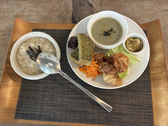 なちゅらるーちぇさんの軽食とともにいただきました。パン生地には、本店やワークショップで販売している葛の葉の青汁(粉末)が練り込まれていてこちらも大変美味しかったです。